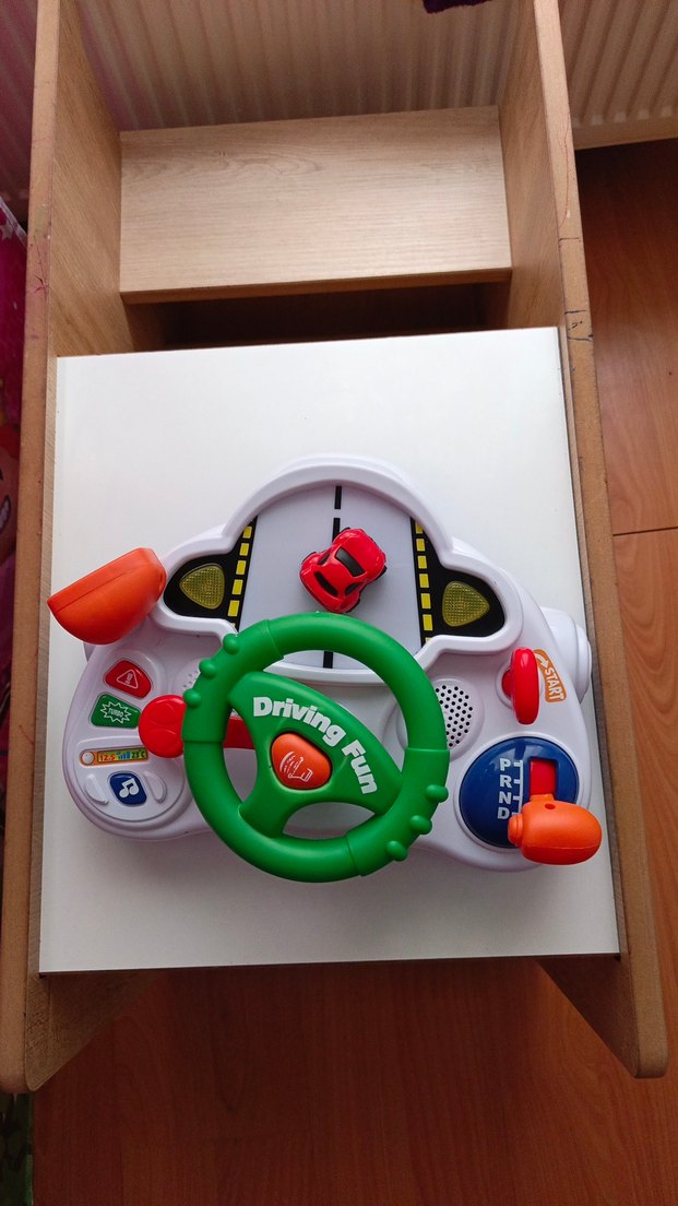 Butonlu ve küçük kırmızı araba detaylı renkli müzikli direksiyon oyuncağı, üzerinde 'Driving Fun' yazısı bulunur.
