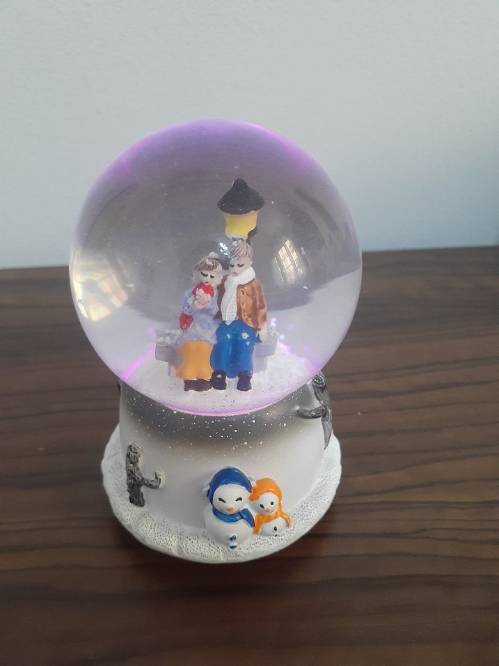 Penguen figürlü beyaz tabanlı, bankta oturan çift ve lamba detaylı renkli müzikli kar küresi. ❄️