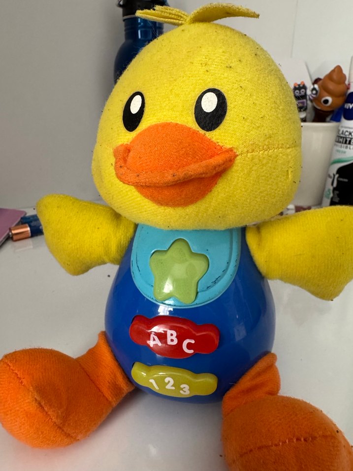 Renkli sarı ördek şeklinde müzikli oyuncak, üzerinde ABC ve 123 butonları bulunur.