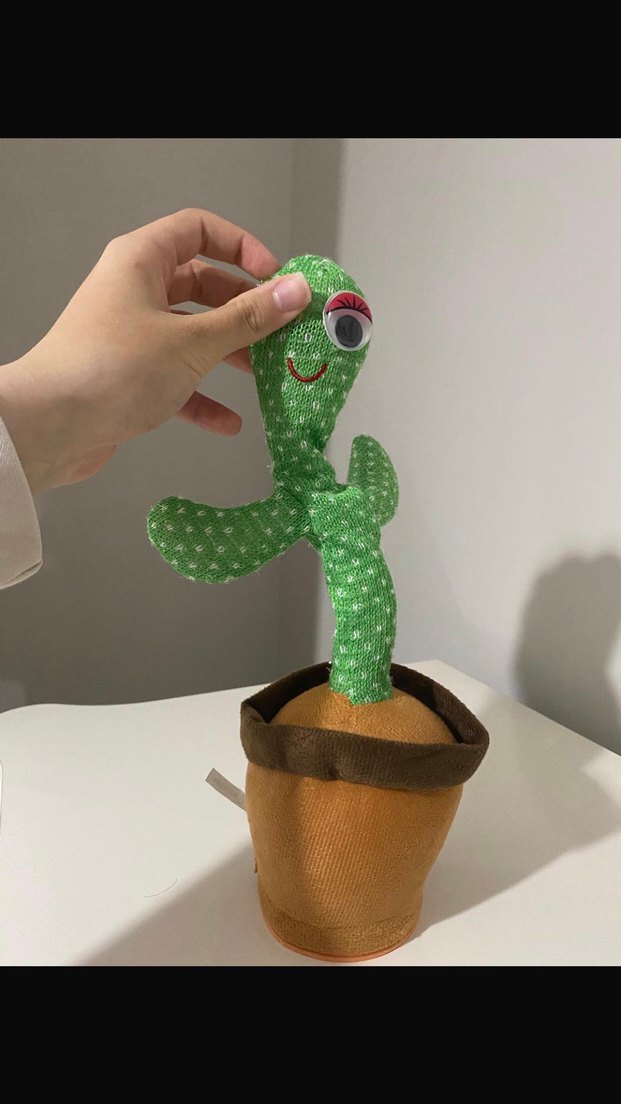 Kahverengi saksıda, yeşil renkli ve göz kırpan yüzüyle renkli bir müzikli oyuncak bitki.