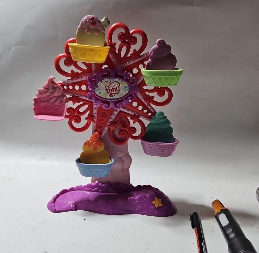 Çeşitli renklerde cupcake şeklinde koltuklara sahip, My Little Pony temalı renkli dönme dolap oyuncağı. Mor taban ve yıldız detayları bulunur.