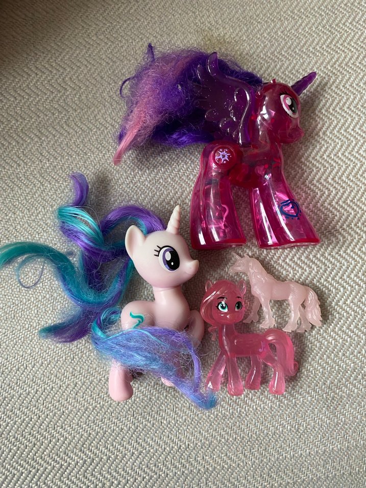 Canlı renklerde, farklı boy ve renkte My Little Pony figürleri seti, parlak yelelere ve şeffaf gövdelere sahip. Büyük olan ışıklı.Fiyatlar hepsinin farklı