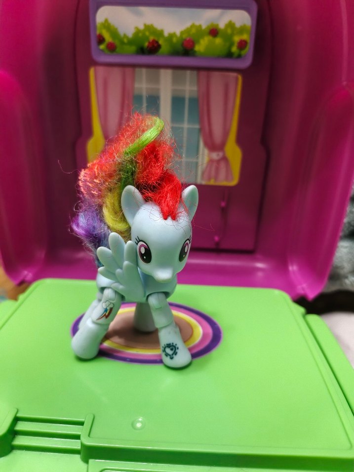 Renkli yele ve kuyruğa sahip, kanatlı My Little Pony figürü. Canlı gözleriyle dikkat çekiyor. Maalesef sacına oyuncak yapıstı