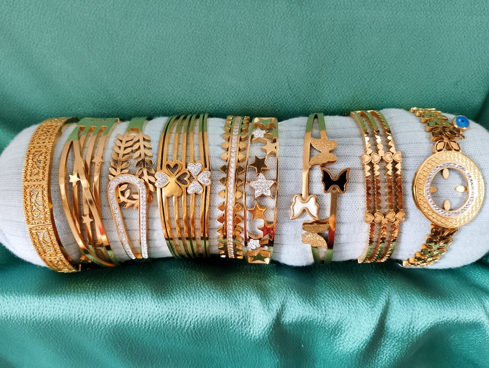 Renkli nakış desenli, elastik bantlı altın renkli bohem bilezikler. Kalp, yıldız ve kelebek figürleri içerir. Günlük kullanım için uygundur. ✨