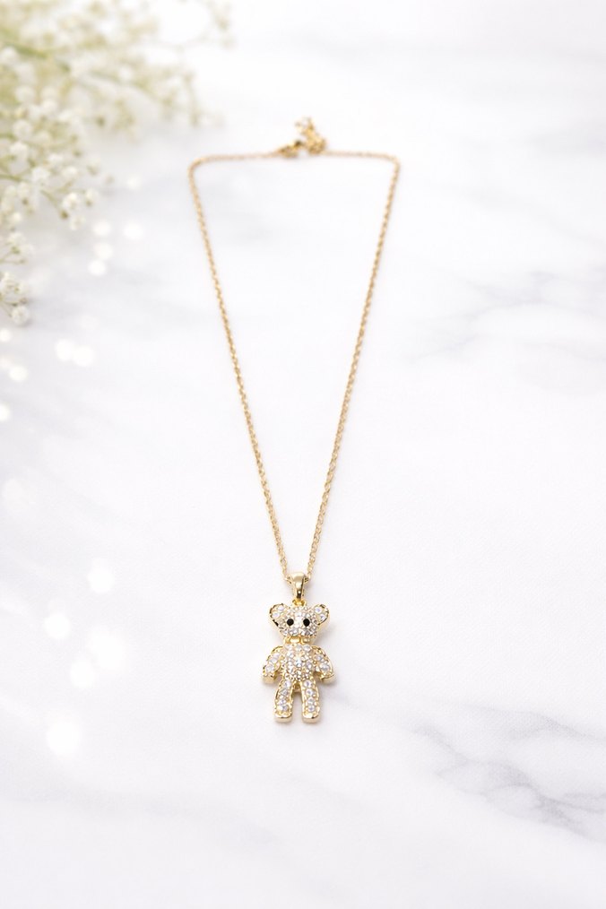 Altın zincir detaylı, renkli nakışlı ayıcık kolye, günlük kullanım ve sokak stiline uygun şık bir parça.