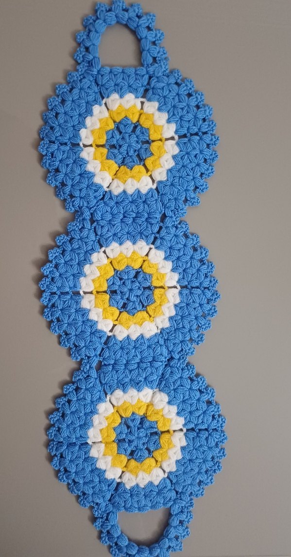 Mavi, sarı ve beyaz nakışlı dairesel desenlere sahip renkli banyo lifi. Yumuşak ve dokulu yapısıyla sağliga hiç bir zarari olmayan doğal çeyizlik günlük lif. Tek fiyati