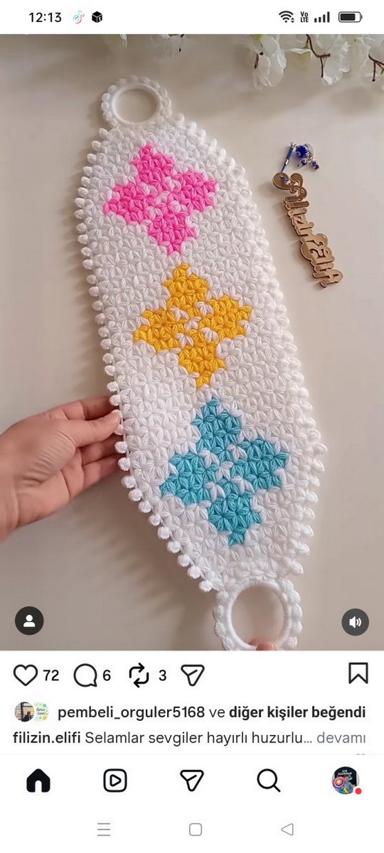 Beyaz zemin üzerinde pembe, sarı ve mavi renklerde nakış desenli, dokulu yüzeye sahip banyo süngeri. Kolay asılabilmesi için halkası bulunur.