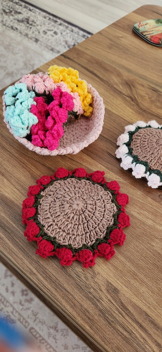 Nakışlı desenli, fırfırlı, renkli örgü bardak altlığı. Çiçek dekor olarak toplu bir şekilde durabiliyor. Kullanılacağı zaman çıkartıp acılıyor. toplam 6 adet