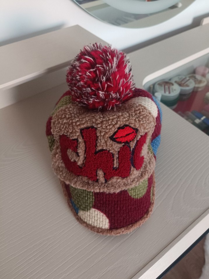 Nakışlı detaylara ve üstünde ponpon bulunan, renkli örgü çocuk bere ve şapka. Bohem ve retro tarzda.