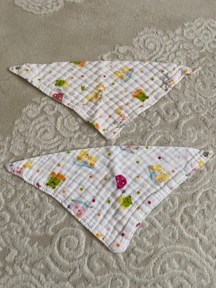 Renkli nakışlı, yumuşak kapitone dokulu bebek önlükleri. Kolay kullanım için çıtçıtlı kapanışa sahiptir.