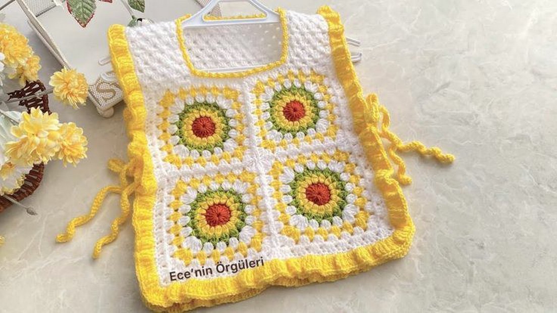 Renkli nakışlı, sarı fırfırlı, el örgüsü desenli bebek önlüğü. 0-6 aylık bebeklere uygundur görsel alıntıdır aynısı yapılır şüpheniz olmasın