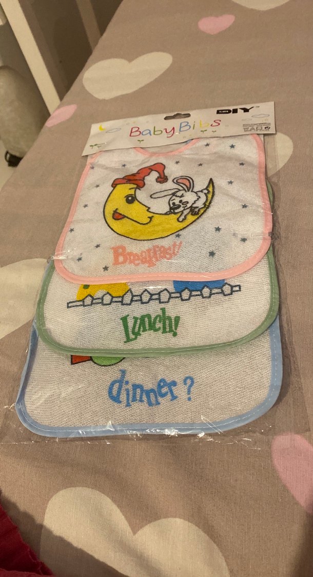 Nakışlı, renkli ve yumuşak kumaştan yapılmış, 'Breakfast', 'Lunch' ve 'Dinner?' yazılı bebek önlükleri seti.