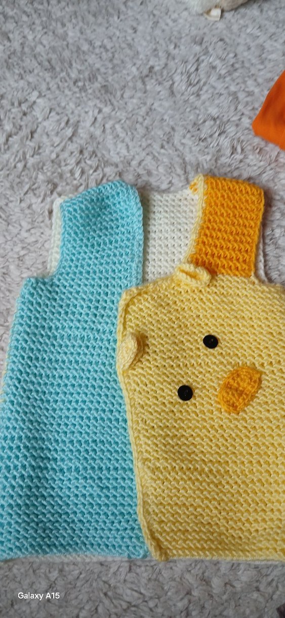 Renkli nakışlı bebek Yelegi yumuşak örme Sarı civciv yüzü ve düz mavi desenleri bulunur. 1 yas uyumludur