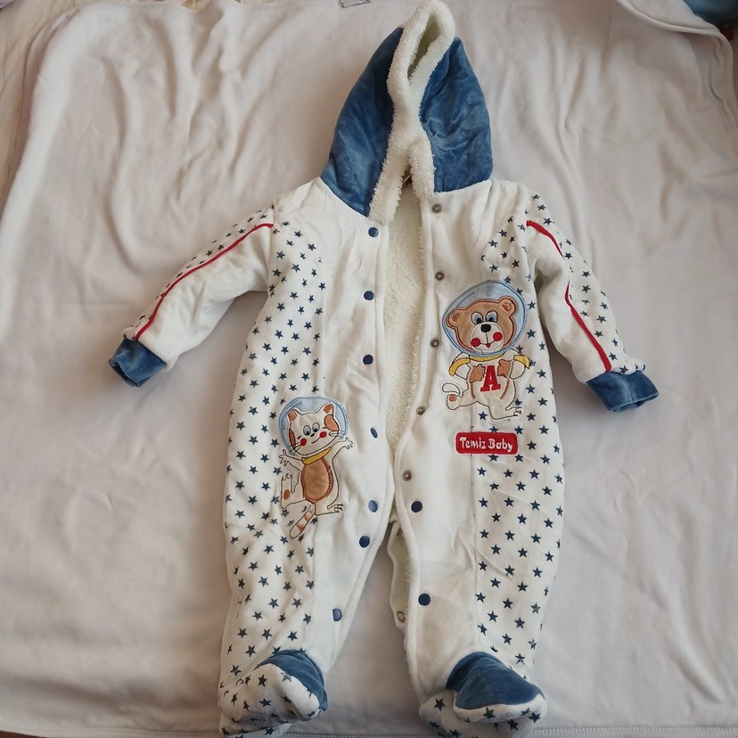 Renkli nakış desenli, kapüşonlu ve kürklü beyaz bebek tulumu, yumuşak ve sıcak kumaştan üretilmiştir. ❄️