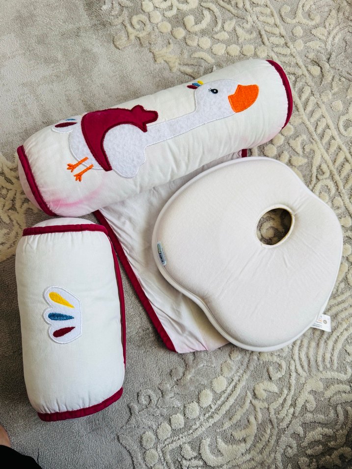 Renkli nakışlı desenlere sahip beyaz yastık ve iki yumuşak çocuk uyku minderi içerir. Rahatlık için sıcak ve yumuşak kumaştan üretilmiştir. Ürünler sağlam hiç bir sorunu yok