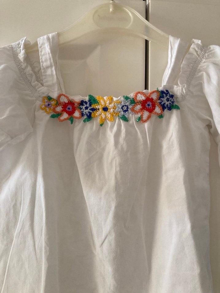 Renkli nakışlı çiçek detaylı, kayık yaka ve bol kesimli beyaz kız bluzu. Askılı kollarıyla bohem tarzını yansıtıyor.