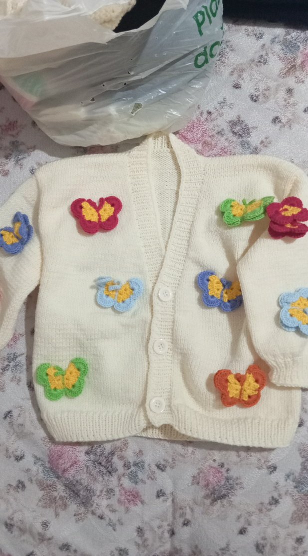 Renkli nakışlı kelebek desenleri ve uzun kollu, bol kesim beyaz örgü kız hırkasıdır.