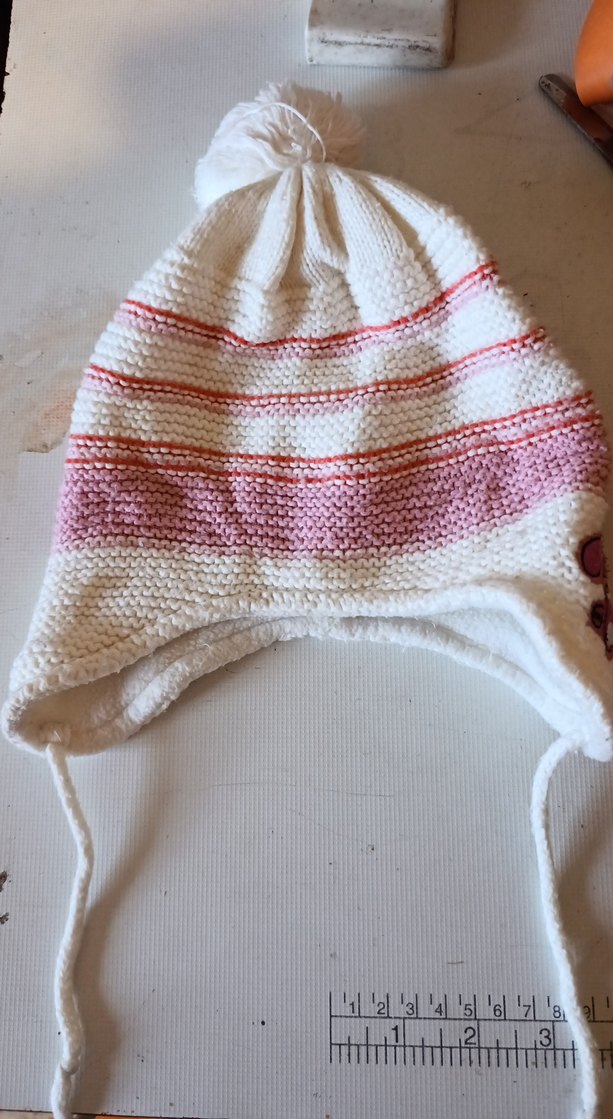 Renkli nakışlı çizgiler ve kulak kapakları bulunan beyaz örgü çocuk beresi, bohem tarzını yansıtıyor.