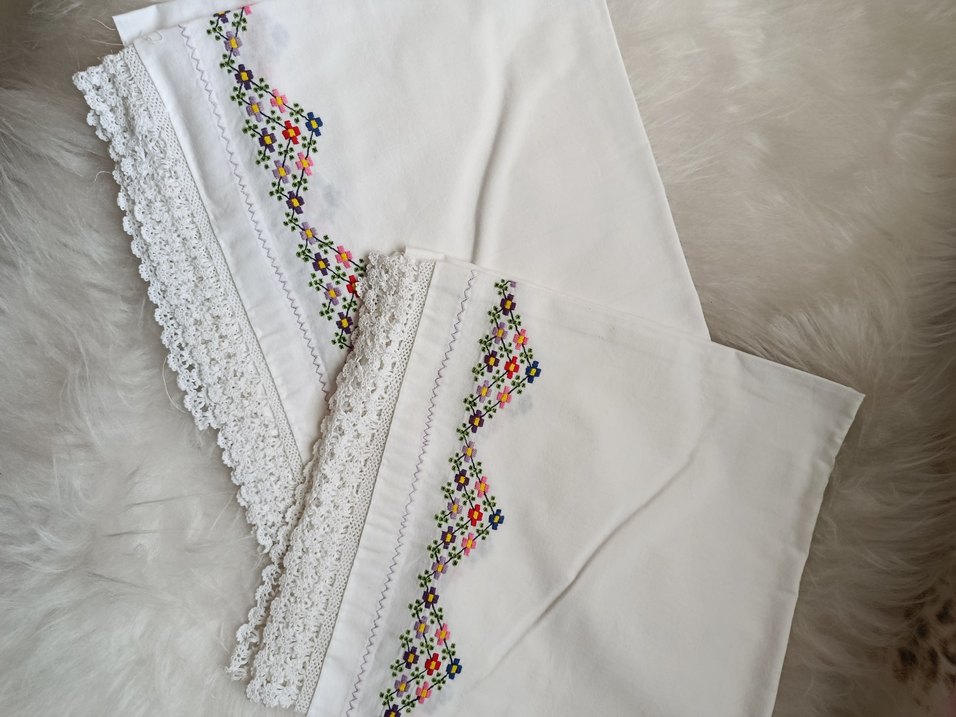 Renkli nakışlı çiçek desenleri ve kenarlarında ince dantel süslemeleri bulunan beyaz yastık kılıfı.