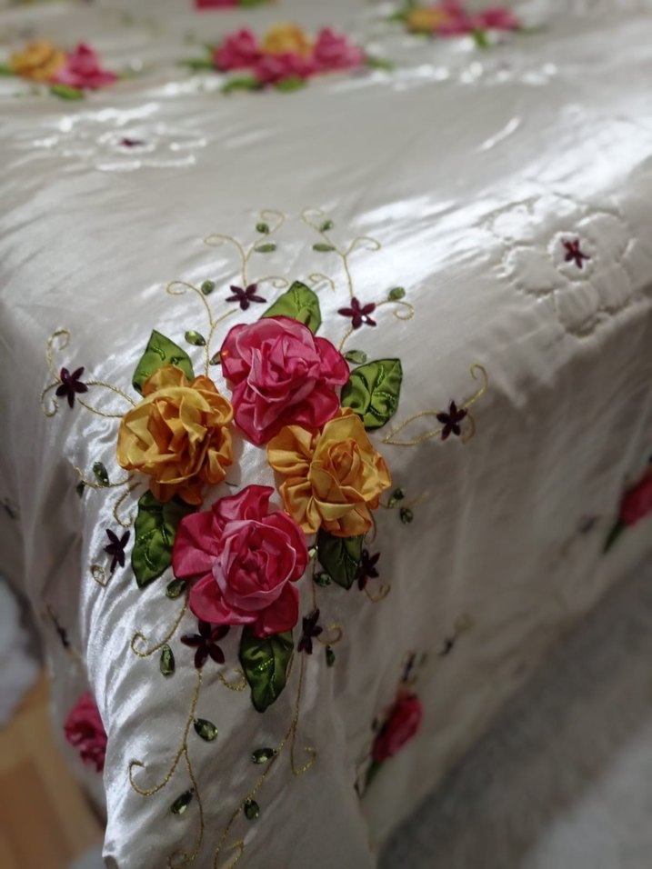 Beyaz yatak örtüsü, renkli nakışlı çiçek desenleriyle odanıza canlılık katıyor. Sıfırdır ceyız için ve el işi seven için tam idealdır