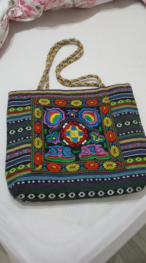 Renkli nakışlı tekstil ve boncuk detaylı bohem tarzı kadın çantası, günlük kullanıma uygundur.