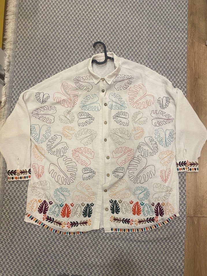 Renkli yaprak nakışlı, bol kesim ve kısa boy kadın gömleği. Uzun kollu, yakalı ve düğmeli, hafif kumaştan bohem tarzda. Ben s bedenim L ye de olur. O yüzden bedeni m giriyorum.