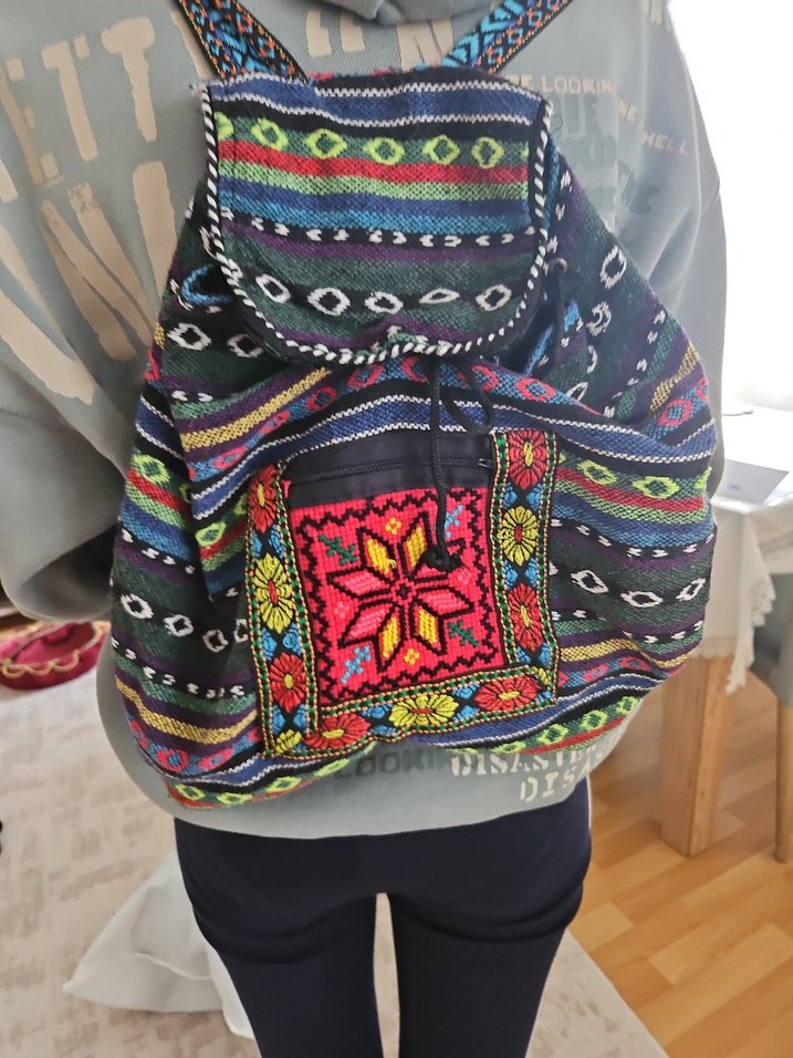 Renkli nakışlı tekstil kumaştan, tokalı kapanışı olan bohem kadın sırt çantası, günlük kullanıma uygun.Marka temsili