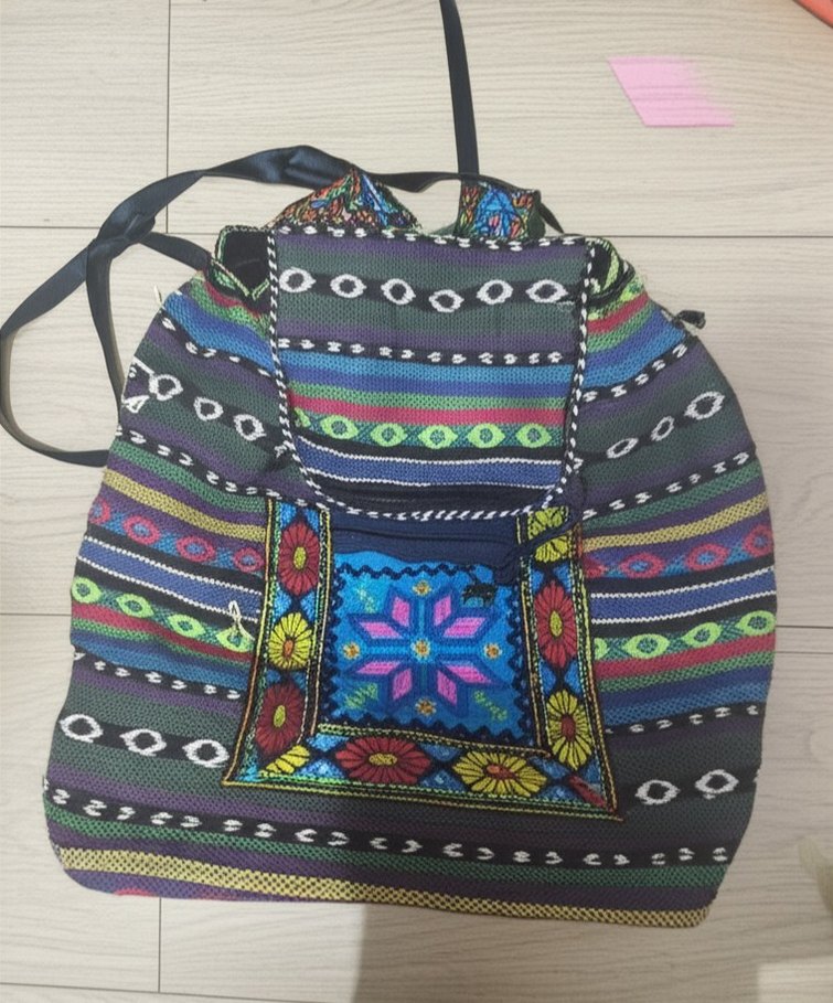 Nakışlı desenlere sahip çok renkli, sentetik kumaştan bohem tarzı kadın sırt çantası. Fermuarlı bölmeleri vardır, günlük kullanım için uygundur.