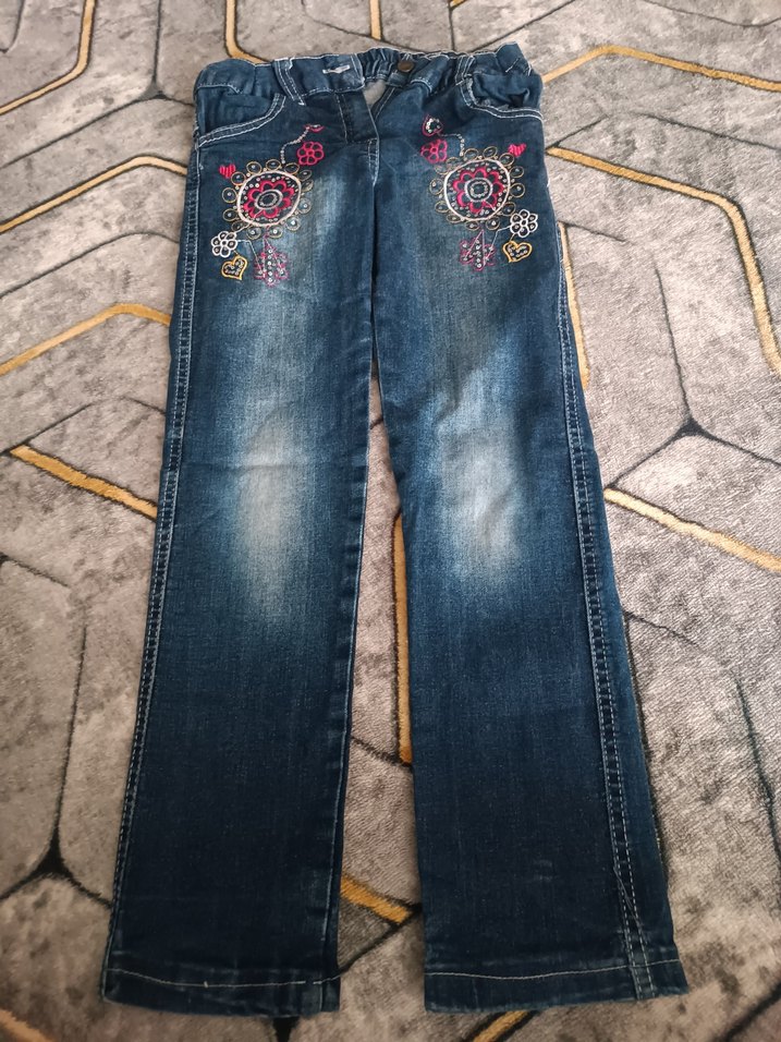 Renkli nakış detaylı, düğmeli, bol kesim mavi kot pantolon. Bohem tarzını yansıtır.