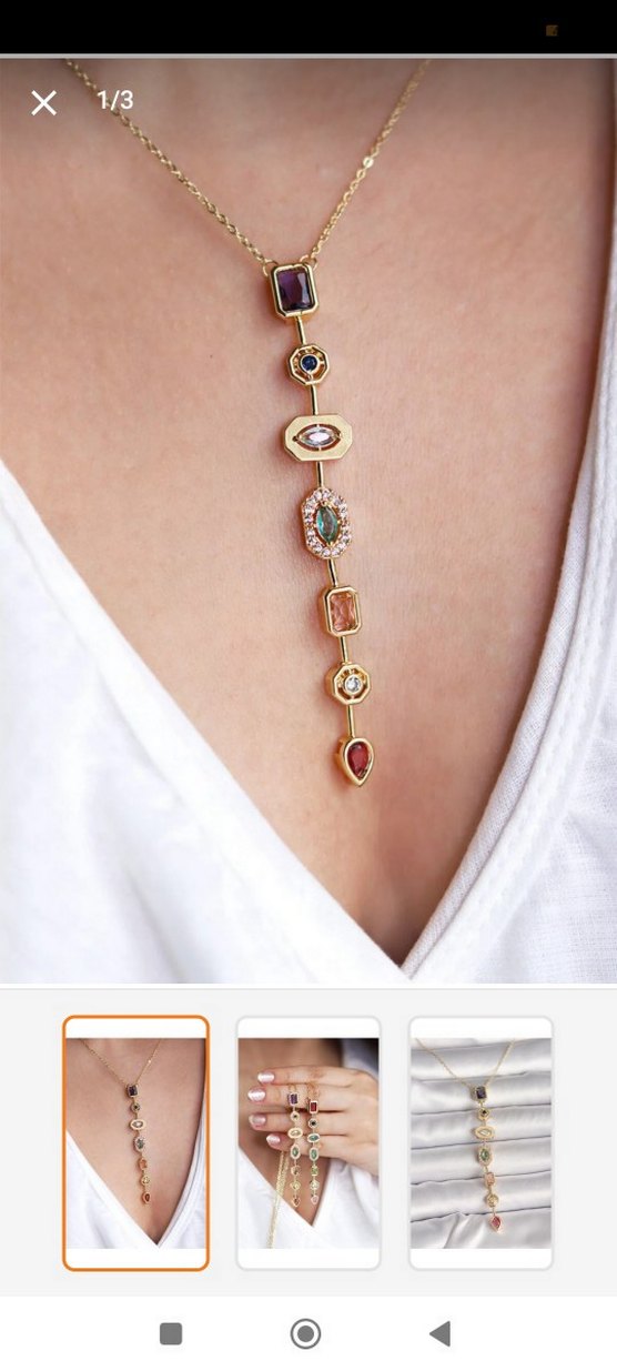 Bohem tarzda, zincir detaylı ve çok renkli nakış desenli kolye. Normal midi uzunluğunda, günlük kullanım için uygundur.
