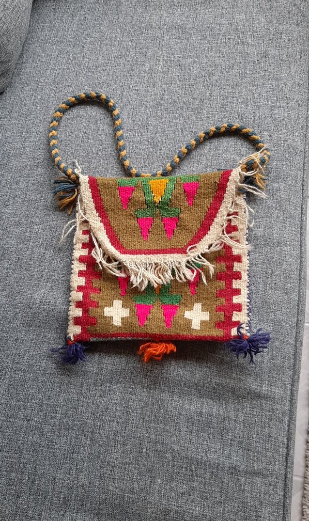 Nakışlı desenler ve püsküllerle süslenmiş renkli örgü çanta, bohem tarzında ve örgülü askılıdır. Günlük kullanım için uygundur.