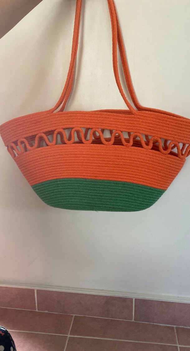 Nakışlı desenlere ve fırfır detayına sahip, renkli örme kumaştan bohem plaj çantası. Çift askılı ve günlük kullanıma uygun.