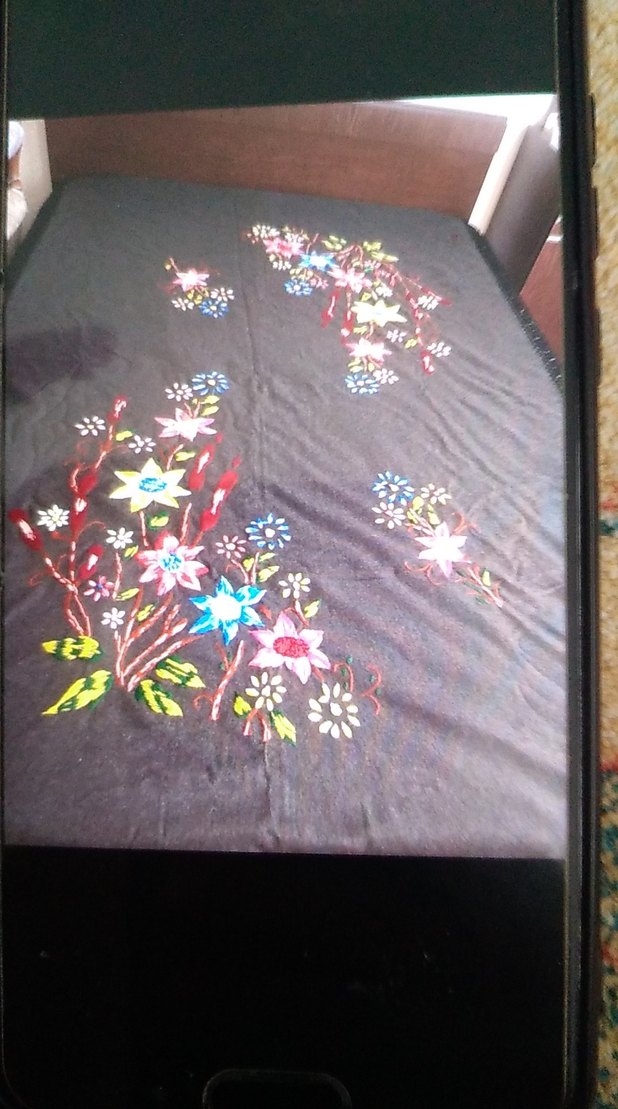 Koyu renkli, çok renkli ve nakışlı çiçek desenlerine sahip bohem tarzda yatak örtüsü,el işlemesi canlılık katar. kaşe kumaş tir