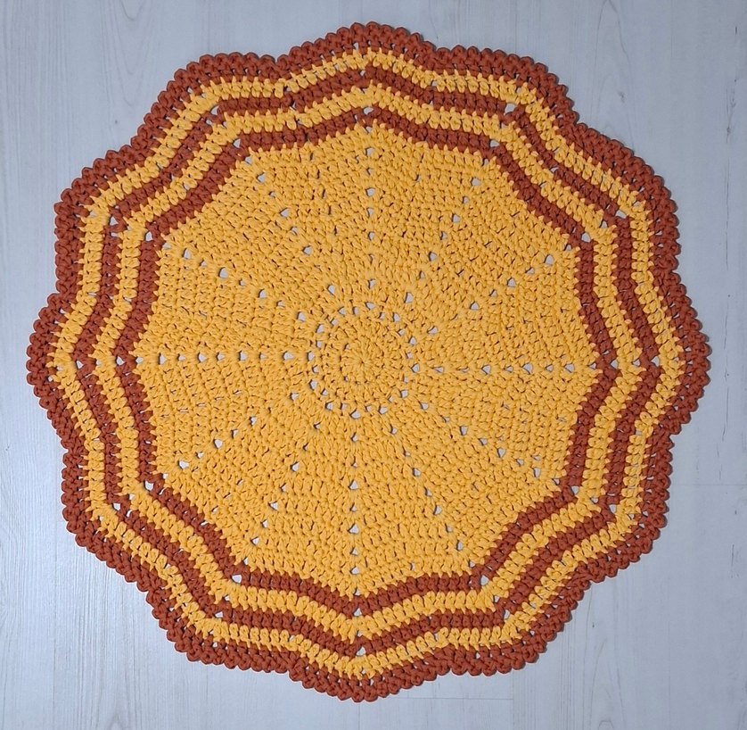 Canlı sarı ve turuncu tonlarda nakışlı renkli bohem yuvarlak halı, mekana sıcak ve dekoratif bir dokunuş katar. 85×85cm