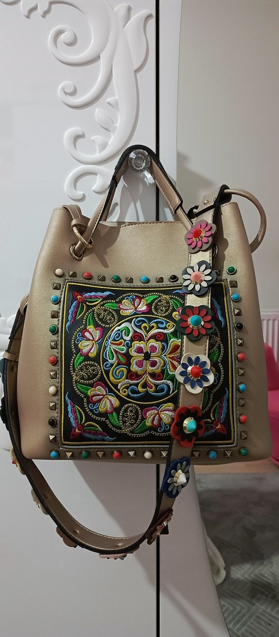 Bu renkli deri çanta, detaylı nakış desenleri ve boncuk süslemeleriyle bohem tarzını yansıtıyor.
