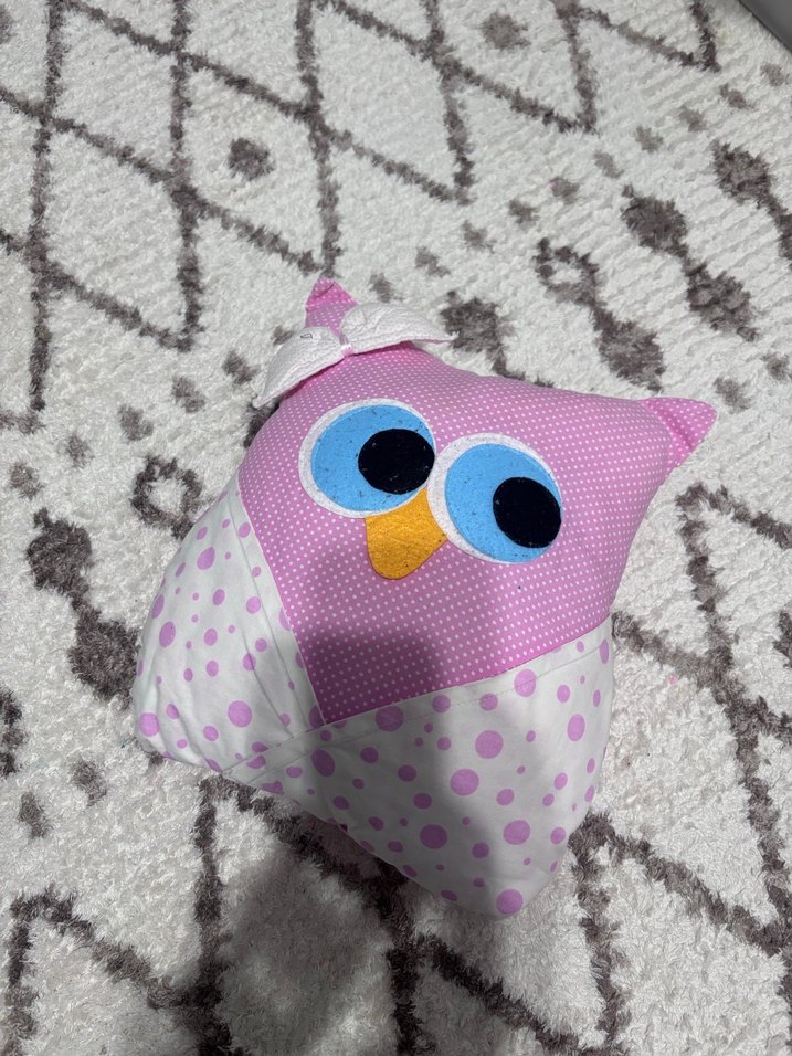 Renkli nakış detaylı, yumuşak sentetik kumaştan yapılmış pembe ve beyaz tonlarında baykuş şeklinde çocuk yastığı.
