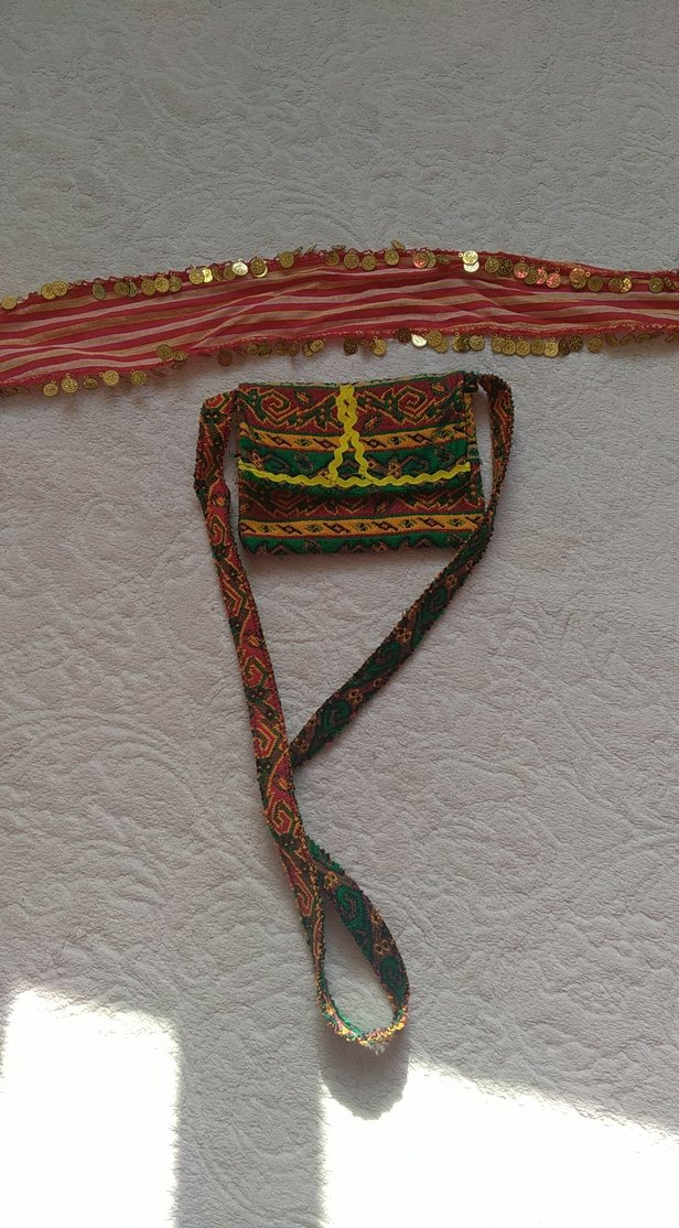 Renkli nakış desenlerine sahip, belden takılan çocuk çantası. Bohem ve retro tarzı yansıtıyor.