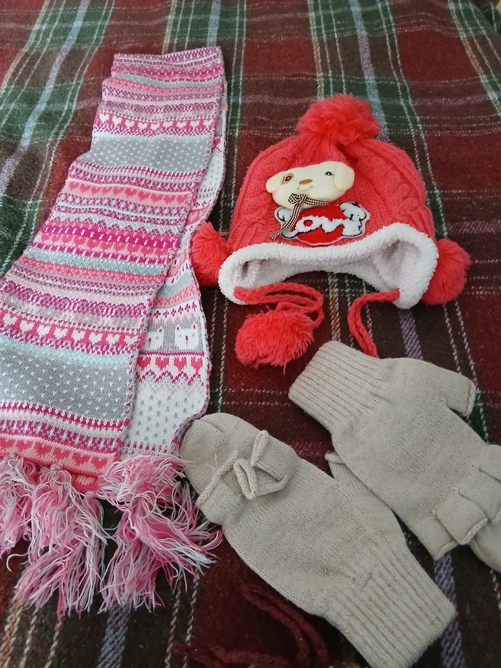 Renkli nakışlı pembe bere, kulaklıklı ve ponponlu, desenli püsküllü atkı ile krem renginde parmaklı eldivenlerden oluşan örme set.