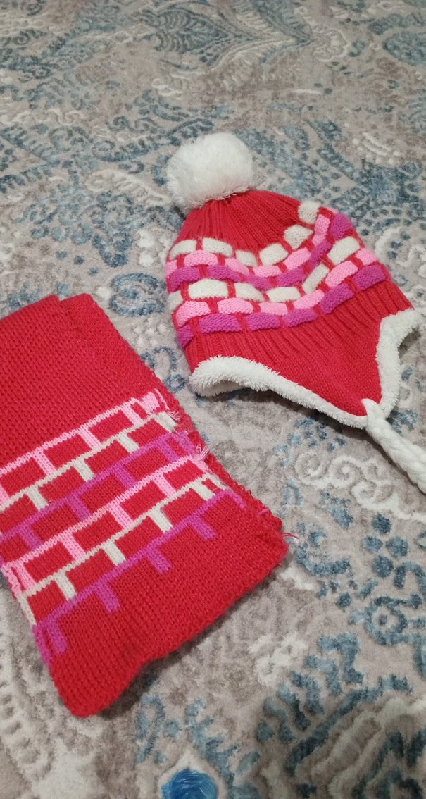 Nakış işlemeli ve yumuşak dokulu renkli örme çocuk bere ve atkı seti, bohem tarzına uygun.