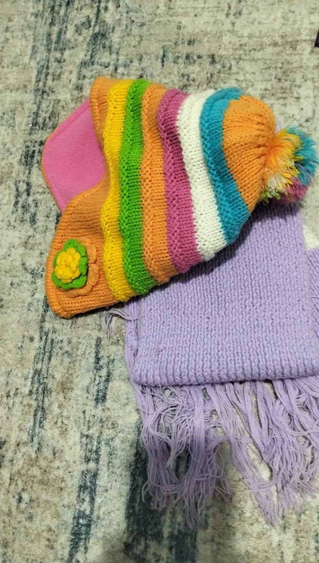 Nakışlı detaylara ve ponponlu bereye sahip renkli çocuk bere ve atkı seti. Bohem ve retro tarzda.