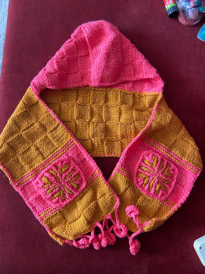 El örgüsü atkı bere motif cepler. Renkli nakış desenli, yumuşak örme kumaştan çocuk bohem kapşonlu atkı.