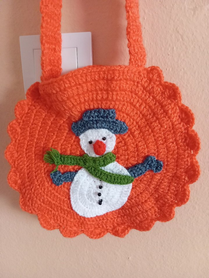 Renkli, nakışlı kardan adam figürlü, yuvarlak şekilli, yumuşak örme kumaştan çocuk çantası Takması kolay askısı vardır. ❄️