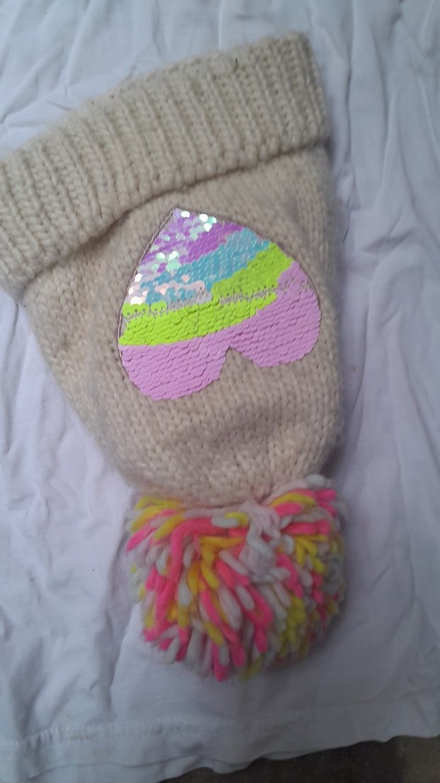 Renkli nakışlı payet kalp ve çok renkli ponpon detaylı çocuk örgü bere, bohem tarzı için uygun.