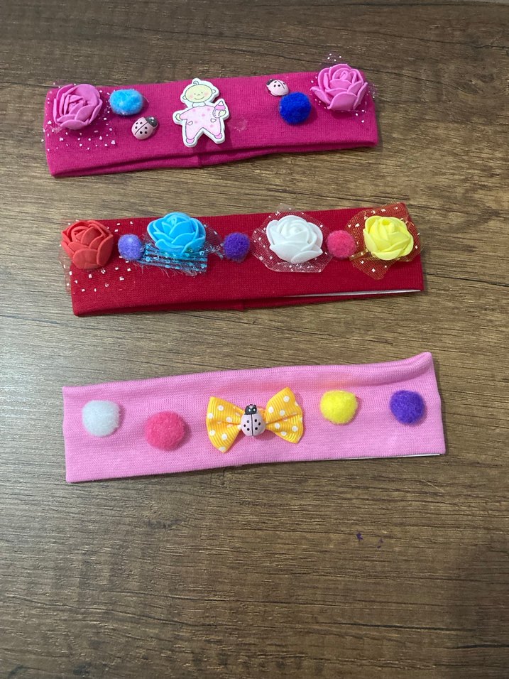 Nakışlı ve fiyonk detaylı, renkli çocuk saç bantları. Bohem tarzda, ponpon ve çiçek süslemeleriyle retro bir görünüm sunar.3 adettir