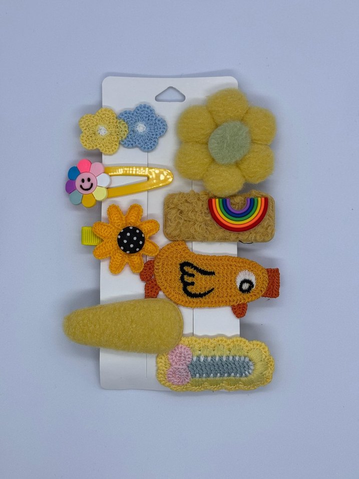 Velcro kapamalı, nakışlı renkli çocuk saç tokaları. Çiçek, kuş, gökkuşağı ve gülen yüz desenleriyle bohem tarzda.