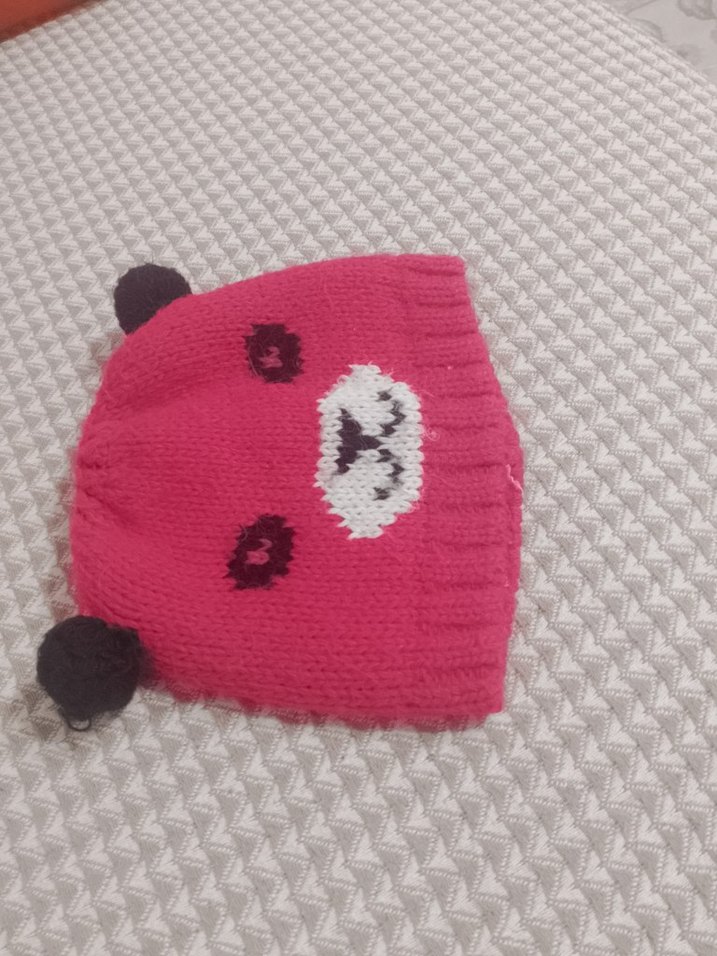 Renkli nakışlı ayı yüzü detaylı, küçük ponpon kulaklı, yumuşak triko malzemeden yapılmış çocuk bere.