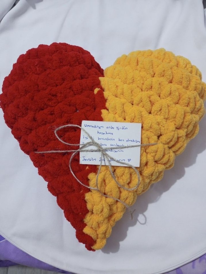 Renkli nakışlı desenli, yumuşak triko kumaştan kalp şeklinde çocuk yastığı. ❤️