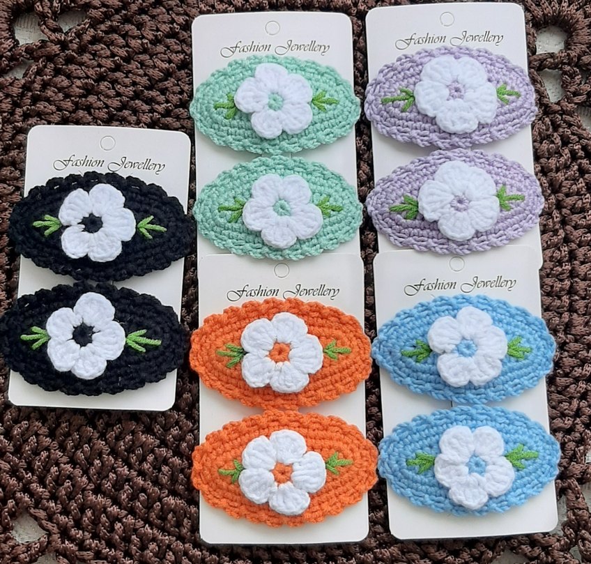 Çeşitli canlı renklerde, dantel üzerine nakışlı beyaz çiçek detaylı bohem tarzı renkli saç tokaları. Adet fiyatıdır renk belirtiniz.