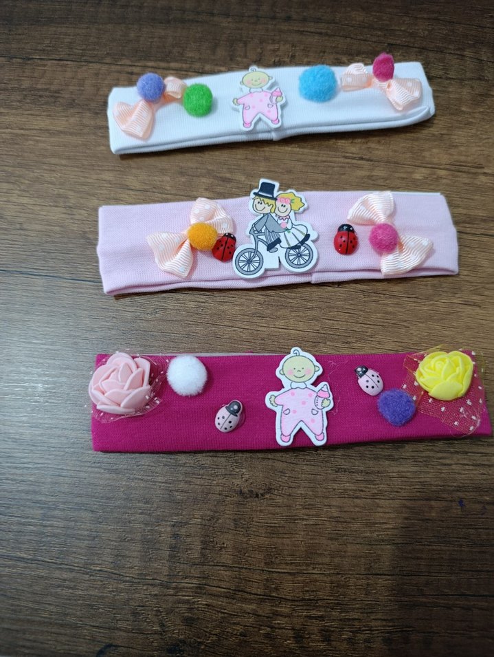 Renkli nakışlı, elastik çocuk saç bantları; fiyonk, ponpon ve sevimli çizgi karakter süslemeleri içerir. 3 adettir
