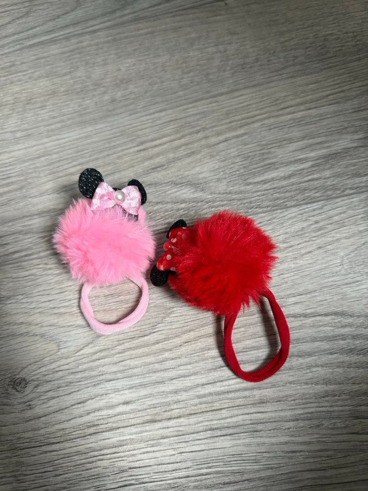 Çocuklar için elastik saç tokaları, renkli nakışlı ve yumuşak tüylü ponpon detaylı, pembe ve kırmızı tonlarında. Rock punk tarzına uygun.